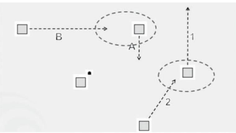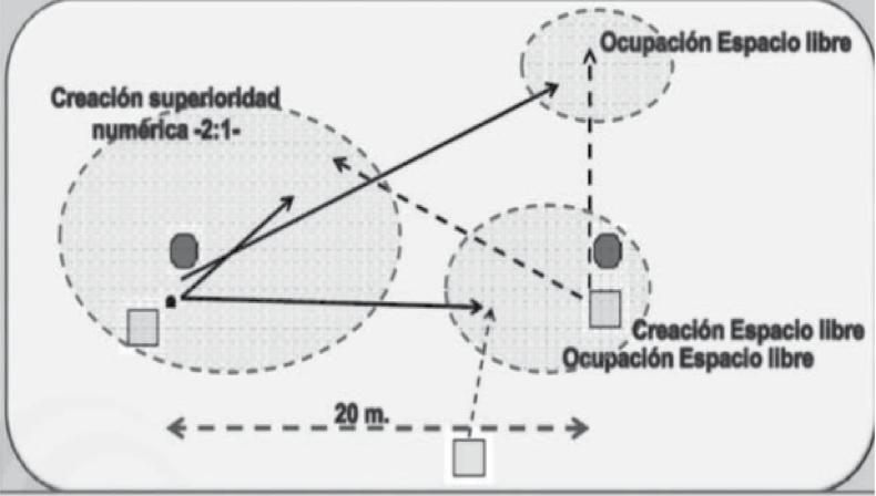 In a 2:2 situation (minimum manifestation of a collective situation), if an optimal exit movement of the area is made to create numerical superiority or take advantage of free spaces, the DEFENSOR must make a decision between two options: