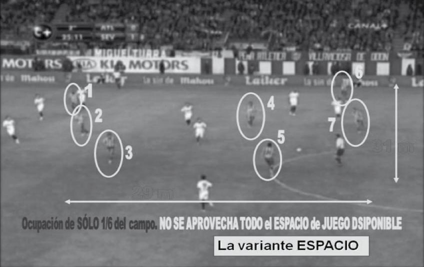 The only chance to eliminate spaces in the face of short play style is by accumulating players in the play area. This action, however, enables large spaces in the areas opposite the ball. In this case, the use of long distance passes (+- 40 m) will provide us with the intended objective.
